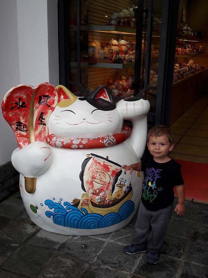 Esse foi o ápice da viagem para o Gabriel, o encontro com um gatinho chinês.
